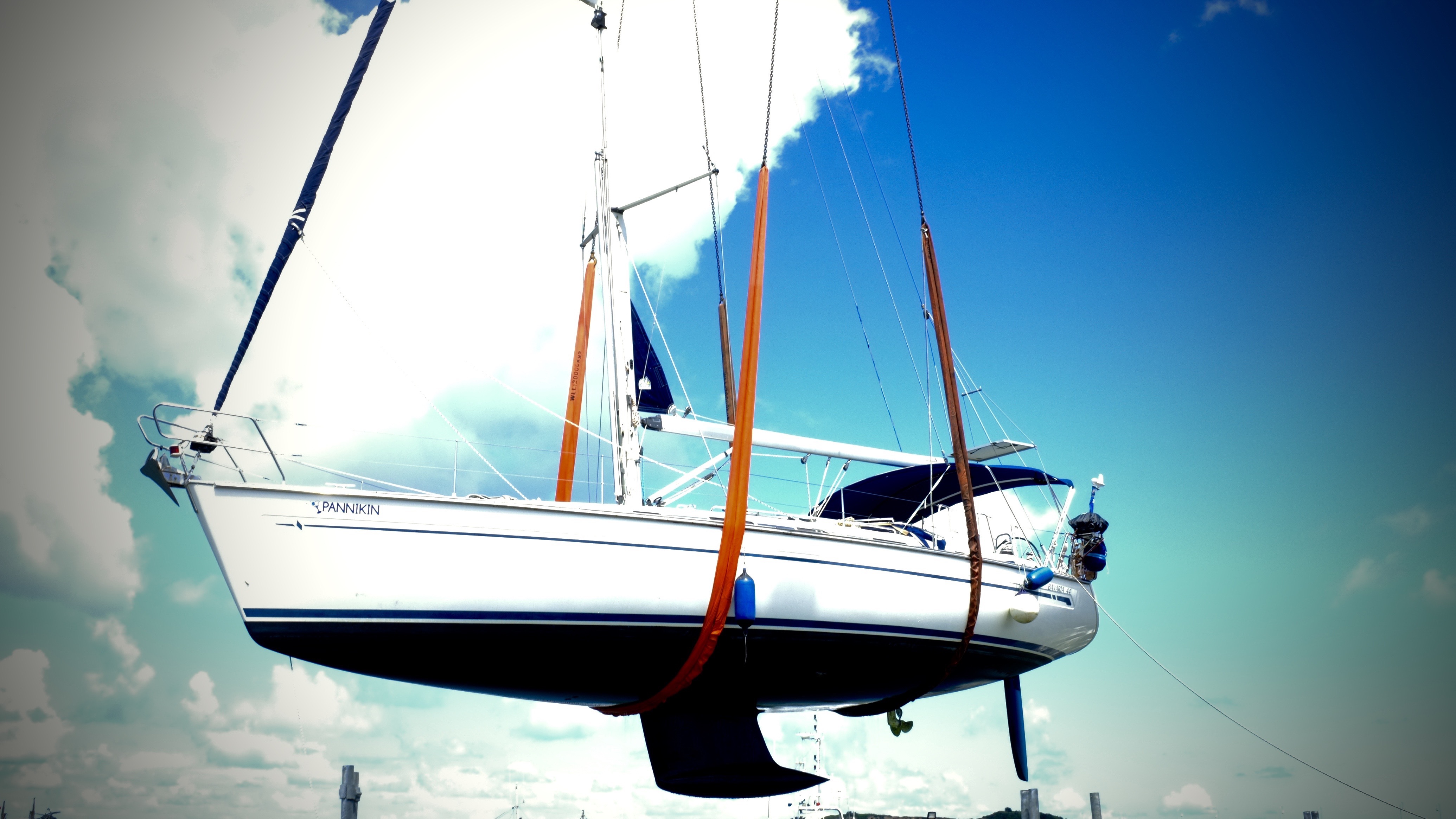 Boat being lifted for below waterline inspection.